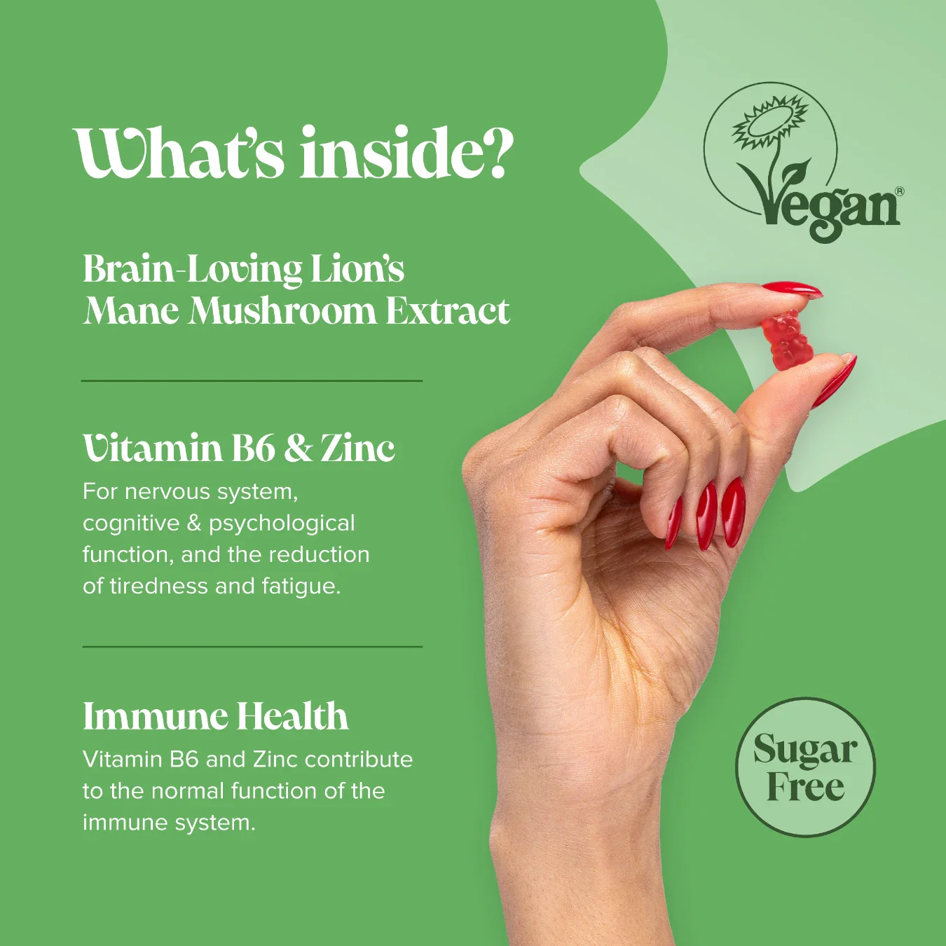 Our Kids Lion’s Mane Gummies are formulated with brain-loving botanicals and nutrients. Each strawberry-flavoured gummy combines Lion’s Mane extract with vitamin B6 for psychological function, as well as zinc for normal cognitive and immune system function. Our formulation is also sugar-free and vegan friendly.
