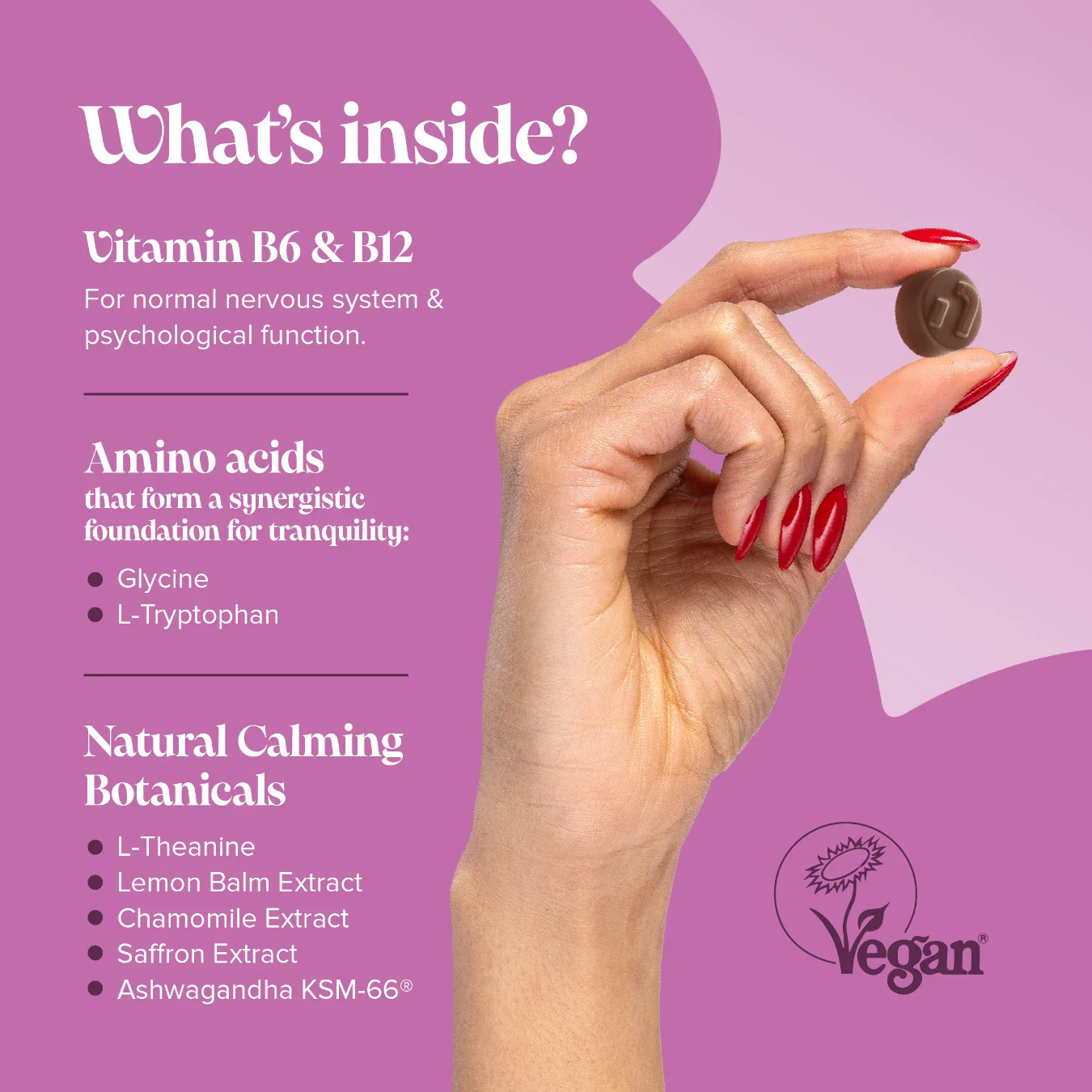 Our Relax Gummies are rich in adaptogenic bioactives like Ashwagandha KSM-66, L-Theanine, Lemon Balm, Chamomile, Saffron, Glycine, and L-Tryptophan - chosen for their gentle and calming nature. With added vitamin B6 and B12 for psychological and nervous system function.